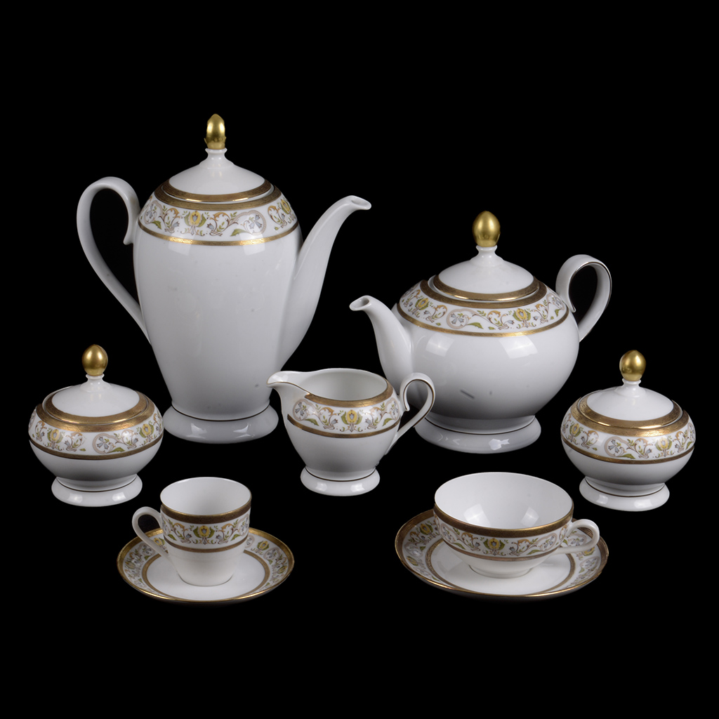 Juego de té y café. Siglo XX. Elaborado en porcelana Seltmann Weider Bavaria. Decorado con motivos florales y vegetales. Consta de: tetera, cafetera, 2 azucareras, cremera, 12 tazas para té con 12 platos base y 12 tazas para café con 12 platos base. Presenta ligeros detalles de conservación. Piezas: 53 Estimado $4,000-6,000