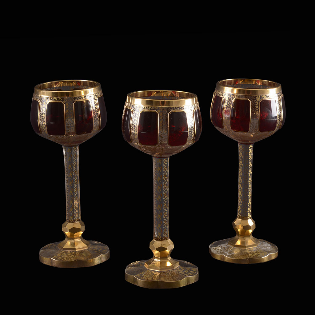 Tres copas. Circa años 70. Elaboradas en cristal de Bohemia, color rojo granate. Con esmalte dorado. Decoradas con motivos vegetales, orgánicos y bandas doradas en bordes. Con bases lobuladas y fustes ochavados. Presentan ligeros despostillados. Estimado $ 1,200-3,000