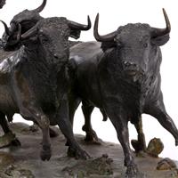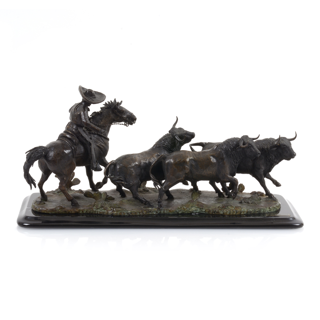 Emilio Fuentes (México). Siglo XX. Arreando toros. Fundición en bronce patinado, serie 5/15. Firmada y referida. Sobre base rectangular. Presenta detalles de conservación. Dimensiones: 28 x 60 x 25 cm. Estimado $ 7,000-9,000