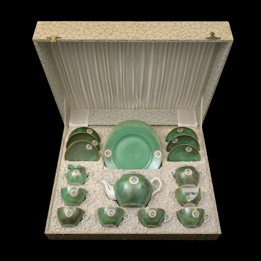 Juego de té. Portugal. Siglo XX. Elaborado en porcelana Vista Alegre. Con esmalte dorado. Decorada con motivos florales. Servicio para 6 personas. Consta de: tetera, 6 platos, 6 tazas con 6 platos base, azucarera y cremera. Con estuche. Presenta detalles de conservación y una taza rota. Piezas: 21 Estimado $ 1,500-3,000