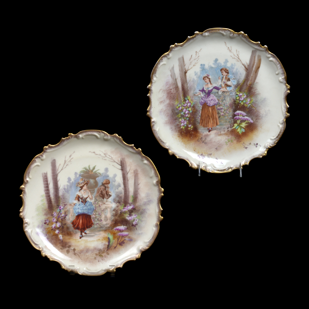Par de platos decorativos. Siglo XX. Elaborados en porcelana. Con esmalte dorado. Decorados con escenas de cortejo. Presentan detalles de conservación. Dimensiones: 33 cm. Ø Estimado $ 1,200-1,500