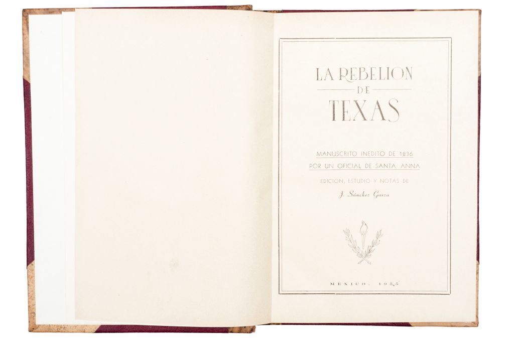 AB - Sanchez Garza, J. (Editor). La Rebelión de Texas. México: Impresora Mexicana, 1955. 4o. marquilla, L + 321 p. Manuscrito Inédito de 1836 por un oficial de Santa Anna: Reseña y Diario de la Campaña de Texas por José Enrique de la Peña. Matamoros, Tamps. Septiembre 15 de 1836. Encuadernado en pasta dura, lomo y puntas en piel. Estimado $ 4,000-5,000