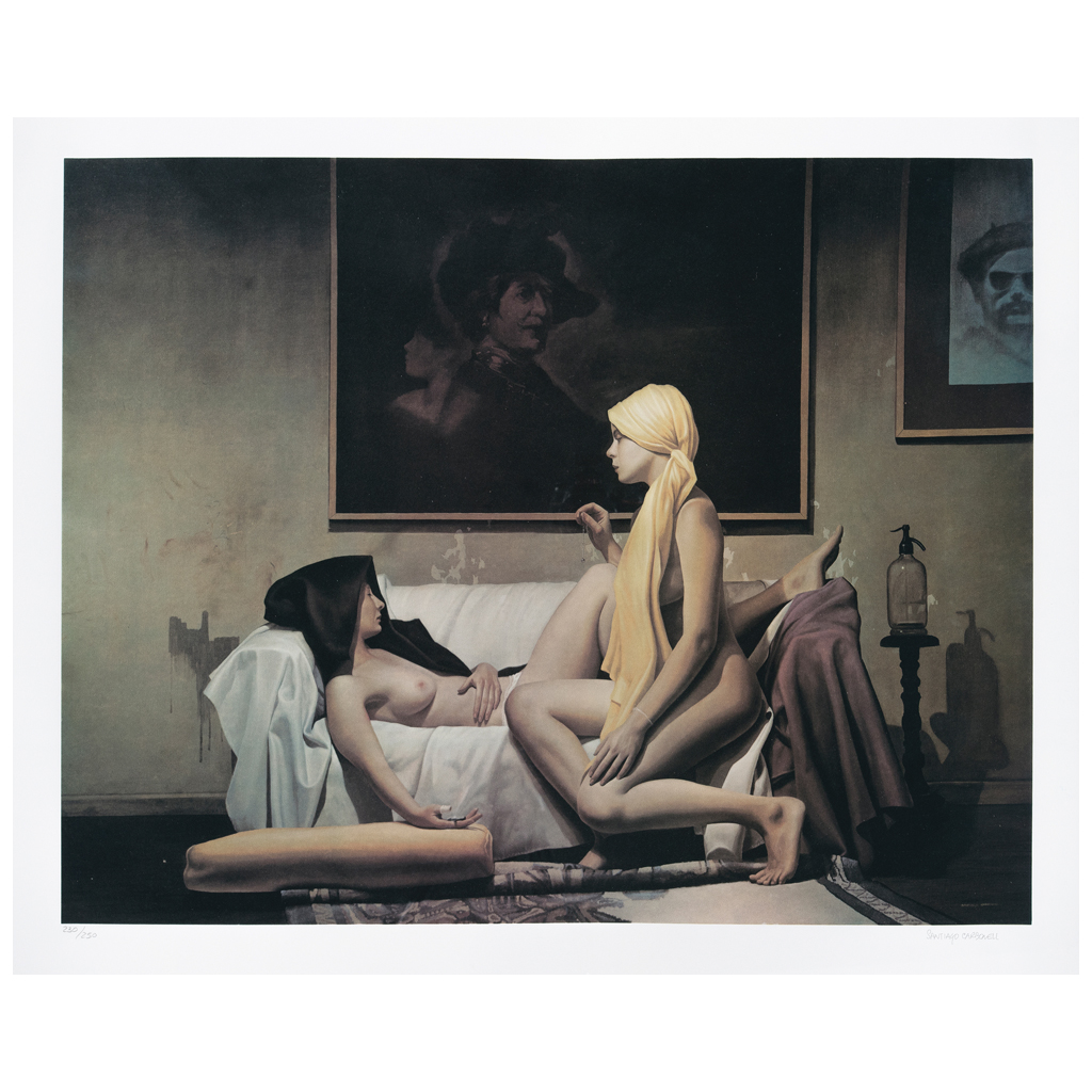 SANTIAGO CARBONELL (Ecuador, Quito, 1960 - ) Mujeres con Rembrandt Firmada Litografía offset con barniz serigráfico 230 / 250 "Carbonell ha hecho suyos a los clásicos; ha recuperado y transformado paletas que se creía habían pasado al olvido, enriqueciendo con su oficio los lenguajes pictóricos puestos al servicio de su indeclinable posición contemporánea". Eduardo Morales. Fuente consultada: MORALES, Eduardo. "En los lienzos de Carbonell…", mayo de 2007. México. Sitio oficial del artista www.santiagocarbonell.com 52 x 66 cm Estimado $ 15,000-25,000