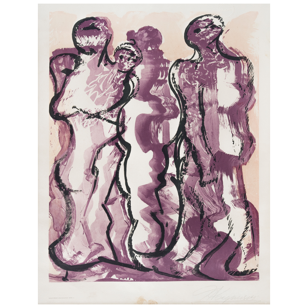 DAVID ALFARO SIQUEIROS (Ciudad de México, 1896 - Cuernavaca, Morelos, 1974) Mujeres en morado Firmada Litografía sin número de tiraje Con sello de agua de Museo Taller de la Composición Siqueiros. Edición de Noscreen de Manuel Quesada Brandi, Editor S.A. Presenta detalles de conservación en el papel. Manuel Quesada Brandi fue un editor y marchante de arte que procuró la litografía mexicana del siglo XIX. Fue editor de autores importantes y realizó diversas ediciones facsímiles de gran calidad. De David Alfaro Siqueiros publicó en varios formatos la colección de fotolitografías del mural "La Marcha de la Humanidad a través de los siglos". 55.5 x 42 cm Estimado $ 12,000-20,000