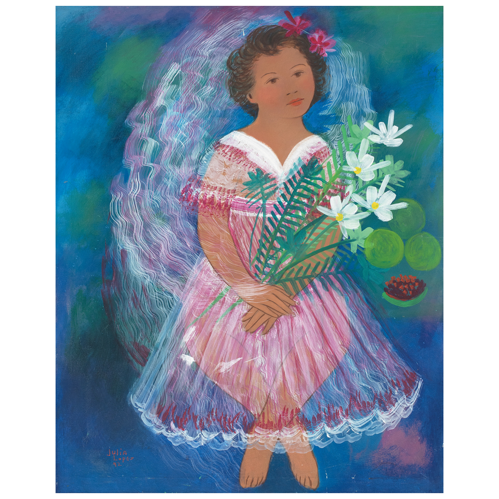 JULIA LÓPEZ (Ometepec, Guerrero, 1936 - ) Recuerdo de comunión Firmado y fechado 92 Óleo sobre tela Presenta detalles de conservación. Frida Kahlo la recomendó para posar como modelo en La Esmeralda y ahí aprendió a pintar de forma autodidacta. Entre amigos como Vlady, Alberto Gironella y Chucho Reyes, también con el apoyo de los maestros, llegó su primera exhibición. Entre 1959 y 2016 ha sido motivo de más de 30 muestras individuales, algunas en San Francisco, Dallas y Nueva York, en Estados Unidos, y en las ciudades de Verona y Milán en Italia. Fuente consultada: FLORES, Alondra. "Rendirán homenaje a la pintora Julia López, la musa de ébano". México. La Jornada, 7 de noviembre de 2016. 100 x 80 cm Estimado $ 25,000-35,000