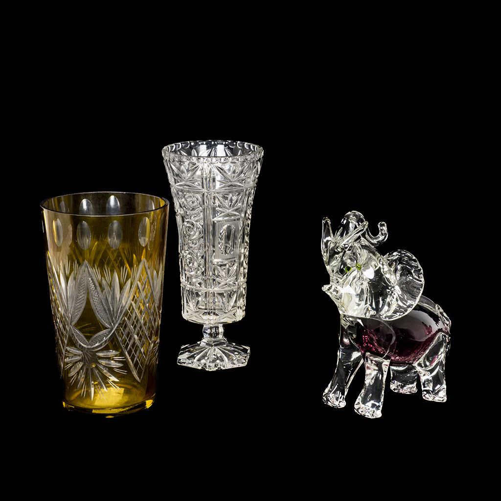 Artículos decorativos. Siglo XX. Elaborados en cristal. Diferentes diseños y tamaños. Consta de: elefante de Murano sommerso, florero de Bohemia color amarillo y florero de cristal cortado. Presentan detalles de conservación, despostillados, marcas y desgaste. Dimensiones: 29 cm. (mayor). Piezas: 3 Estimado $ 1,200-1,500