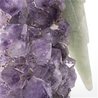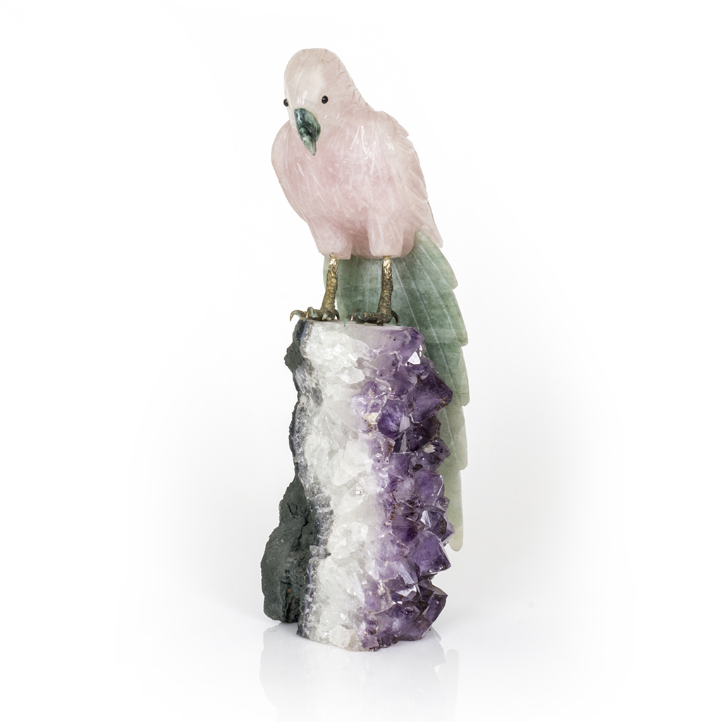 Loro. Siglo XX. Elaborado en cuarzo rosa y verde. Con base de geoda. Presenta detalles de conservación y despostillados. Dimensiones: 38 cm. Estimado $ 3,500-5,000