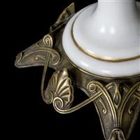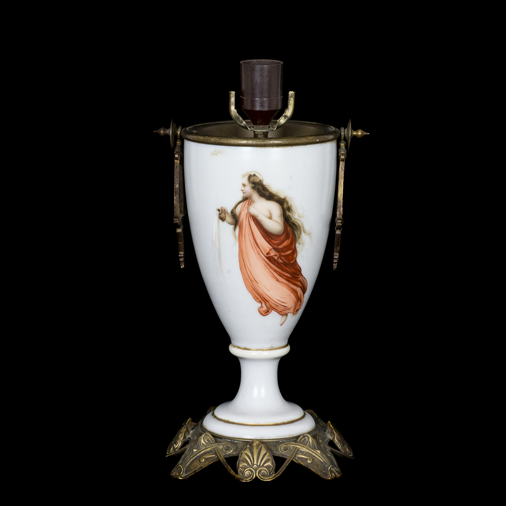 Lámpara de mesa. Siglo XX. Elaborada en bronce y vidrio lechoso. Para 1 luz. Decorada con veneras, roleos e imagen de musa mitológica. Presenta detalles de conservación, marcas y desgaste. Dimensiones: 37 cm. Estimado $ 1,500-2,000