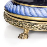 Tibor. Italia. Siglo XX. Elaborado en porcelana color azul cobalto. Con esmalte dorado. Decorado con motivos florales pintados a mano. Sobre base de metal dorado. Presenta despostillados. Dimensiones: 57 cm. Estimado $ 2,400-3,000