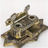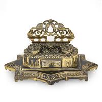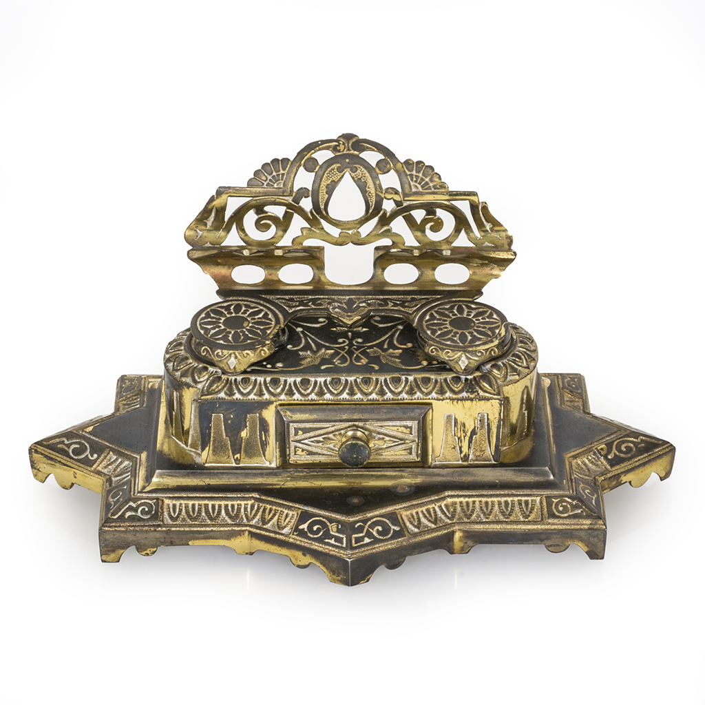 Tintero. Principios del siglo XX Fundición en bronce. Diseño calado. Con cajón y 2 depósitos con tapa abatible. Decorado con motivos florales y orgánicos. Presenta detalles de conservación, marcas y desgaste. Dimensiones: 13 x 26 x 16 cm. Estimado $ 2,000-3,000