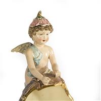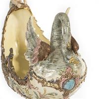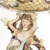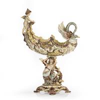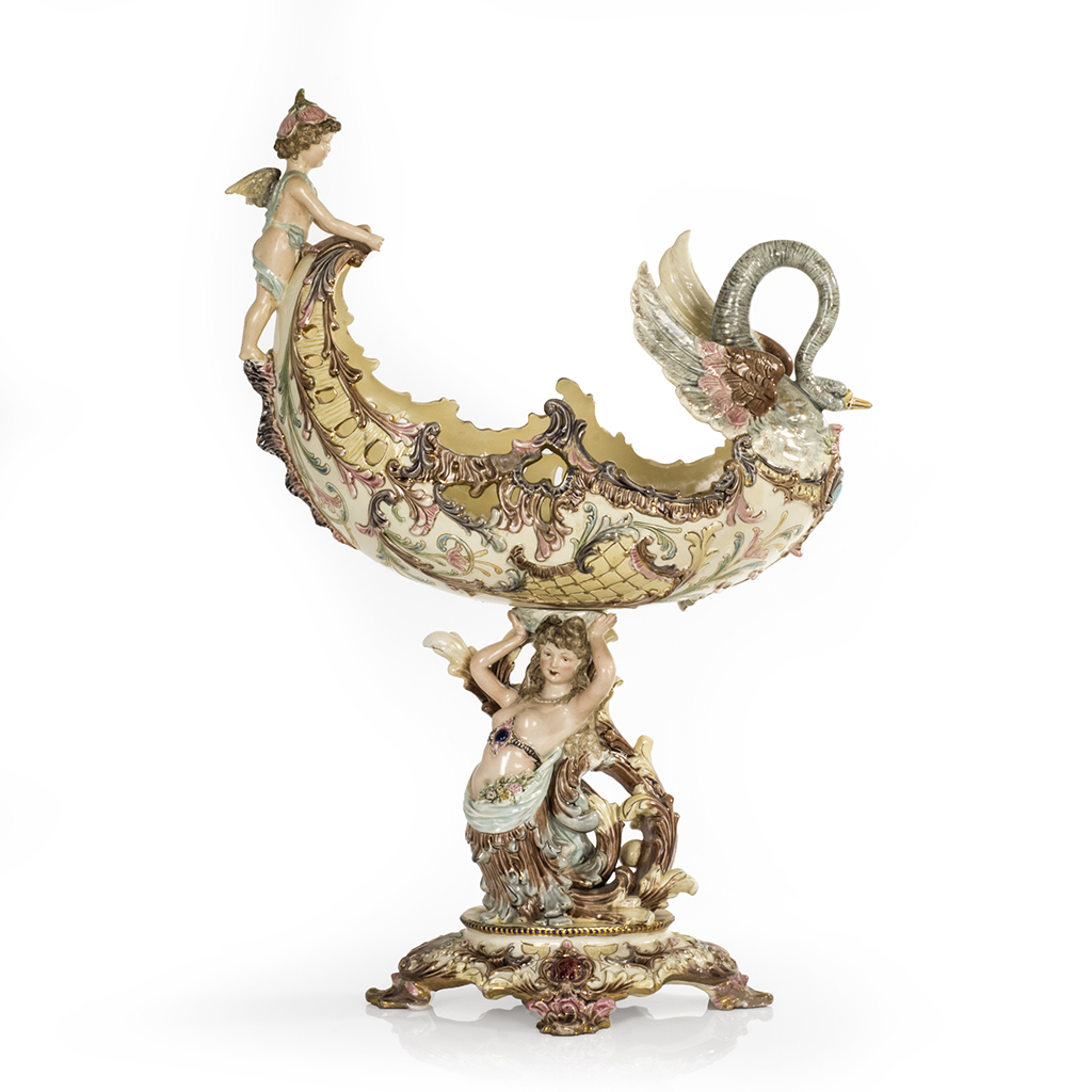 Centro de mesa. Checoslovaquia. Siglo XX. Elaborado en mayólica policromada Eichwald. Con esmalte dorado. Diseño a manera de canoa con un querubín guiado por un cisne y soportada por una sirena con roleos que representan las olas del mar. Decorado con veneras, roleos, acantos, cenefa aperlada y motivos orgánicos de distintos colores en tonos pastel. Sobre base con soportes de diseño vegetal. Presenta detalles de estructura, fisuras, faltantes, restauraciones, marcas y desgaste. Dimensiones: 71 x 49 x 27 cm. Estimado $ 7,000-10,000