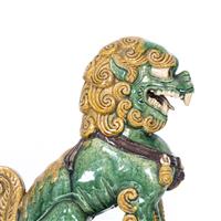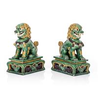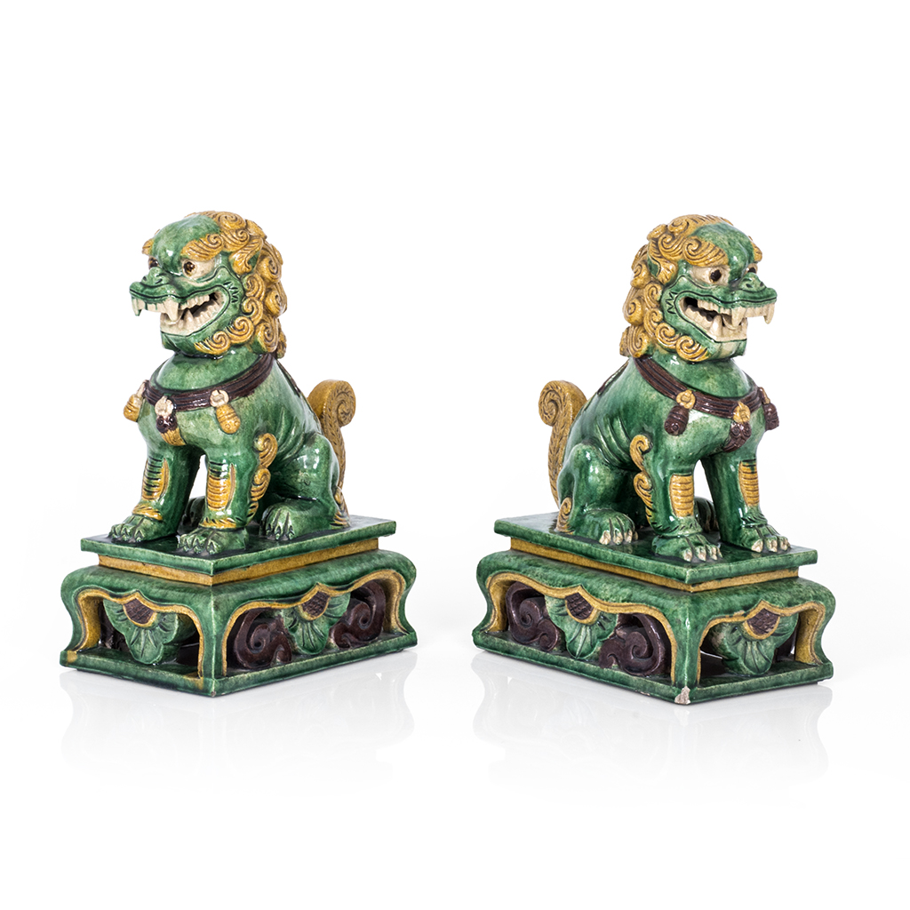 Par de leones Fu. China. Siglo XX. Elaborados en terracota policromada. Bases rectangulares con motivos orgánicos y florales de diseño calado. Presentan detalles de conservación, fisuras, faltantes y restauración. Dimensiones: 30.5 x 20.5 x 14 cm. Estimado $ 2,400-3,000