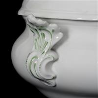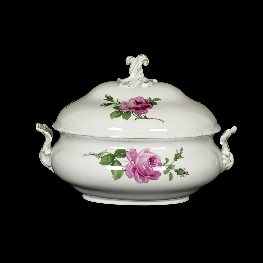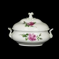 Sopera. Alemania. Siglo XX. Elaborada en porcelana Meissen. Con asas de diseño vegetal. Decorada con remate orgánico en la tapa y motivos florales pintados a mano. Presenta detalles de conservación y ligero desgaste. Dimensiones: 27 x 36 x 26 cm. Estimado $ 4,500-8,000