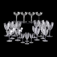 Juego de copas. Francia. Siglo XX. Elaboradas en cristal de Baccarat. Modelo Lagny. Diferentes medidas. Consta de: 11 copas para agua, 12 copas para vino blanco, 12 copas para vino tinto, 13 copas para cóctel, 8 copas para vino dulce y 8 copas para aperitivo. Presentan detalles de conservación y despostillados. Piezas: 64 Estimado $ 5,000-7,000
