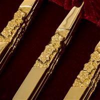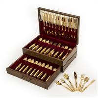 Juego de cubiertos. Siglo XX. Elaborados en metal dorado. Decorados con motivos florales. Servicio para 12 personas. Consta de: 12 cucharas para sopa, 24 cucharas para postre, 12 tenedores para carne, 12 tenedores para ensalada, 12 cuchillos para carne y 3 cubiertos de servicio. Con estuche. Presentan detalles de conservación, marcas y desgaste. Piezas: 75 Estimado $ 1,800-2,500