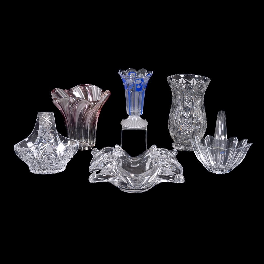 Artículos decorativos. Siglo XX. Elaborados en cristal y vidrio. Diferentes diseños y tamaños. Consta de: centro de mesa de diseño orgánico, 2 canastas y 3 floreros. Presentan detalles de conservación y despostillados. Dimensiones: 30 cm. (mayor). Piezas: 6 Estimado $ 1,800-2,400