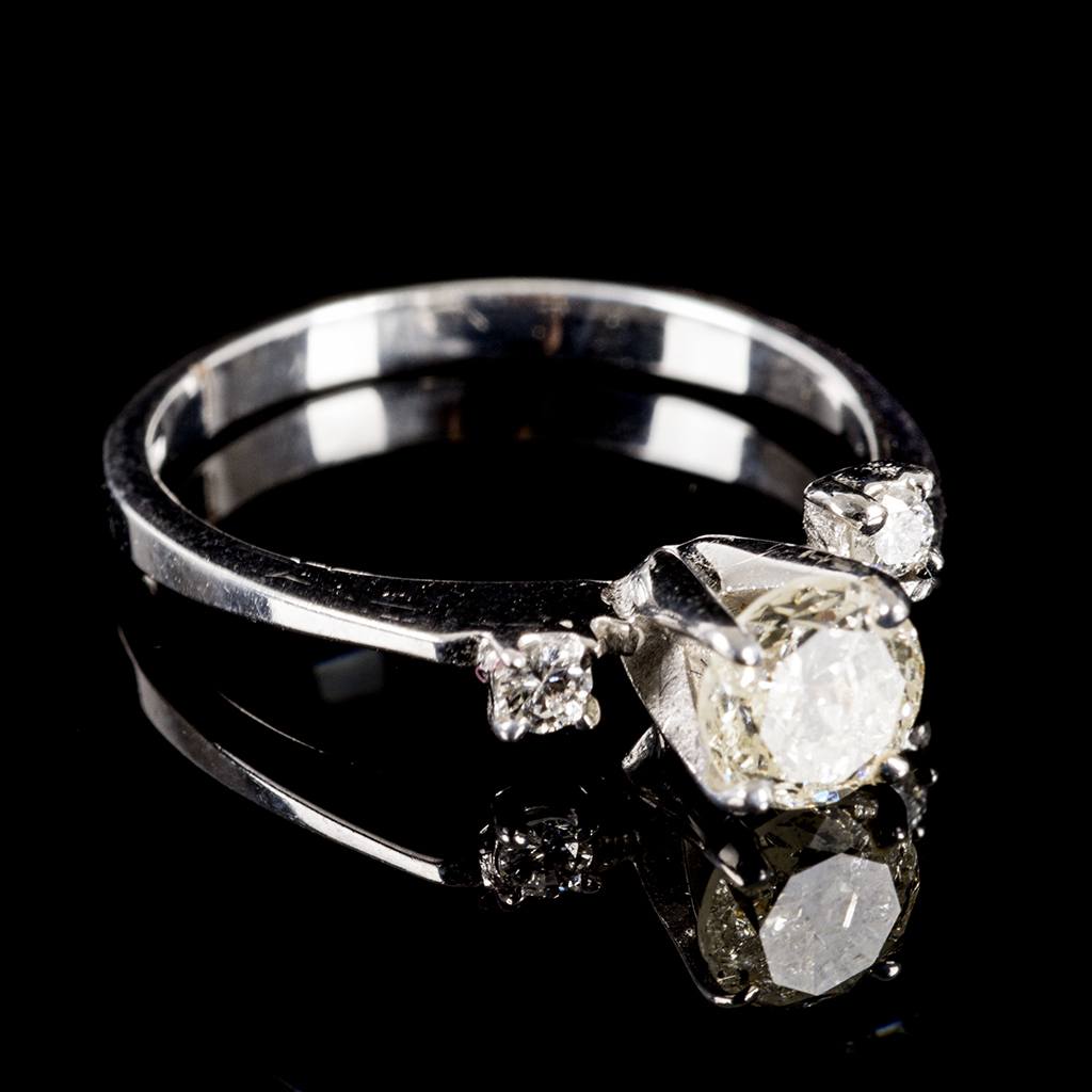 Anillo. Elaborado en oro blanco de 14k. Con 3 diamantes corte brillante, claridad SI2-I2, color I-M, ~ 0.56 ct. Medida aproximada: 5 1/2. Peso: 2.1 g. Estimado $ 4,500-5,000