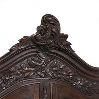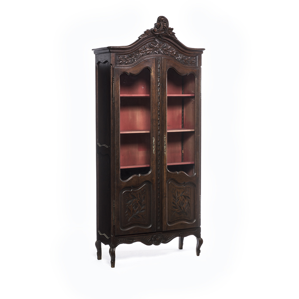 Vitrina. Siglo XX. Estilo Luis XV. Elaborada en madera tallada. 2 puertas con vidrio y soportes tipo cabriolé. Decorado con remate a manera de rocalla, motivos vegetales y florales. Presentan detalles de conservación, de estructura, fisuras, marcas y desgaste. Dimensiones: 186 x 82 x 32 cm. Estimado $ 4,000-6,000