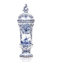 Tibor. Países Bajos. Siglo XX. Elaborado en porcelana Delft. Diseño orgánico. Decorado con vista de molino de viento, motivos vegetales y florales. Presenta detalles de conservación, fisuras, manchas y desgaste. Dimensiones: 45 cm. Estimado $ 3,000-6,000