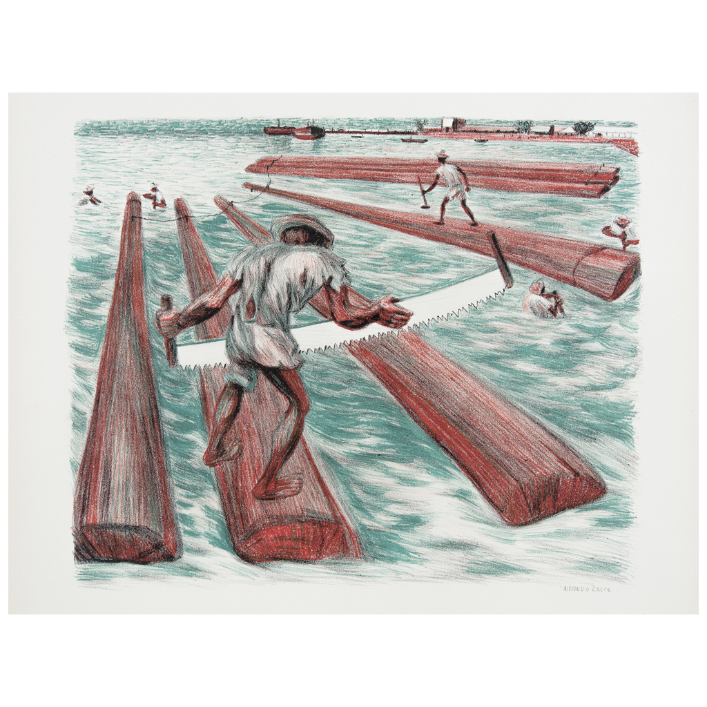 ALFREDO ZALCE (Pátzcuaro, Michoacán, 1908 - Morelia, Michoacán, 2003) Aserradero en Campeche, 1946 Firmada Litografía sin número de tiraje De la carpeta "Mexican People and Customs", impresa por el Taller de la Gráfica Popular y publicada por Associated American Artists, Nueva York, en 1946. Referenciada en el catálogo razonado del Taller de la Gráfica Popular con el No. 608. "Activo partícipe en la renovación formal de la gráfica mexicana, Alfredo Zalce se distinguió por su búsqueda: no se instaló en la suavidad de linóleo, sino que se apropió de la litografía, del grabado en metal lo mismo con ácido que con el buril. Hizo un llamado de alerta sobre las posibilidades del grabado y la inclusión del color desde la placa". Juan Soriano. Fuente consultada: TOVAR Y DE TERESA, Rafael et ál. Alfredo Zalce, noventa años. Recuerdo de una vida, trabajos de un pintor. México. Telmex, 1998, Pág. 81. 28.5 x 35.5 cm Estimado $ 6,000-10,000