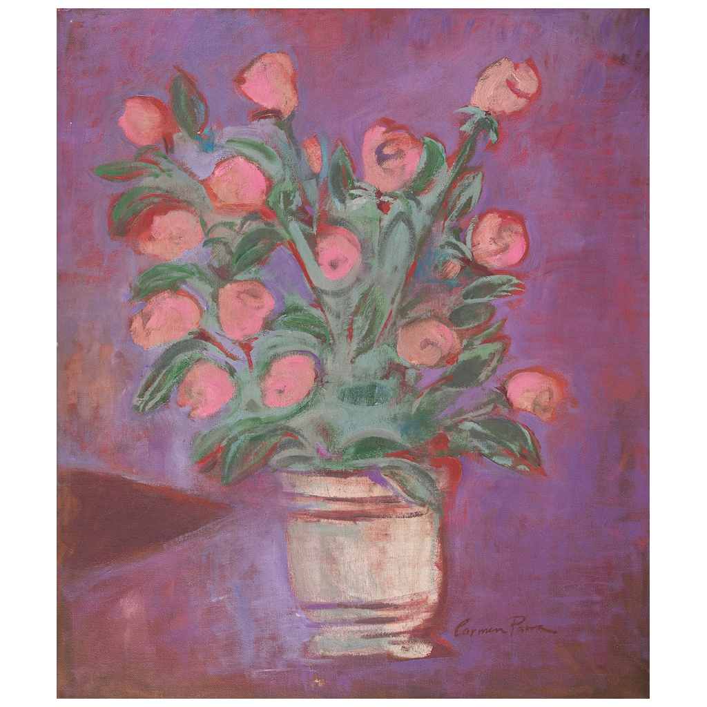 CARMEN PARRA (Ciudad de México, 1944 - ) Flores Firmado Óleo sobre tela Agradecemos al Maestro Emiliano Gironella Parra por la verificación de autenticidad de esta obra, noviembre de 2016. Presenta ligero desprendimiento de capa pictórica en la parte inferior. 70 x 60 cm Estimado $ 40,000-50,000
