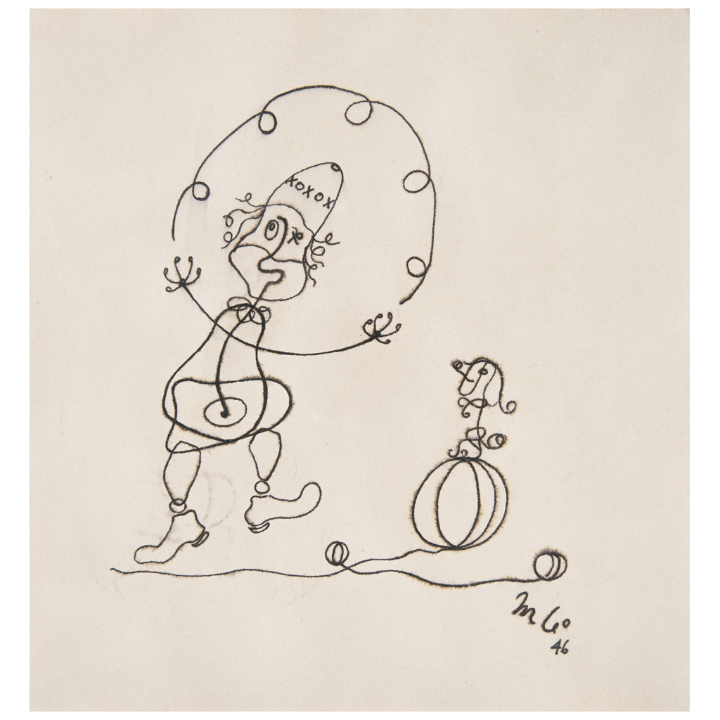 MATHIAS GOERITZ (Danzig, Polonia, 1915 - Ciudad de México, 1990) De la serie El circo Firmada y fechada 46 Tinta sobre papel Mathias Goeritz llegó a Granada en 1945, la Guerra Civil Española había dejado en él una profunda herida, sin embargo, aún así se entregó con gran ímpetu a la pintura, ejecutando diversas series que revelaron su vivencia y sentir. Al año siguiente, expuso en la Sala Clan, utilizando por primera vez el seudónimo de "Magó", el cual reúne las primeras sílabas de su nombre y apellido. En 1947 se instaló en Madrid, época en la que se sitúa la estrecha amistad con Ángel Ferrant. Más adelante, de manera especial se empapó del estilo lúdico de Miró y Calder, remitiéndose al empleó de la línea como si fuesen garabatos, figuras en alambre como lo hacía Calder en los años 20, naciendo de ellas una serie de obras, entre las que destaca el tema del circo: payasos, ciclistas, acróbatas, arlequines, animales, etc. Fueron ejecutadas entre 1937 y 1948, por lo cual hay ciertos cambios de estilo, no obstante, todas ellas ejecutadas con gran dinamismo, gracia e ironía. Algunas obras de esta serie fueron publicadas en 1949 en la revista "Hoy", editada en Barcelona por Rafael Santos Torroella. Fuentes consultadas: KASSNER, Lily. Mathias Goeritz: Una biografía. México. Universidad Nacional Autónoma de México, INBA, CONACULTA, 2007, Pág. 40 y sitio del Museo de Arte Contemporáneo Español, Patio Herreriano www.museopatioherreriano.org 17.5 x 16.2 cm Estimado $ 20,000-30,000
