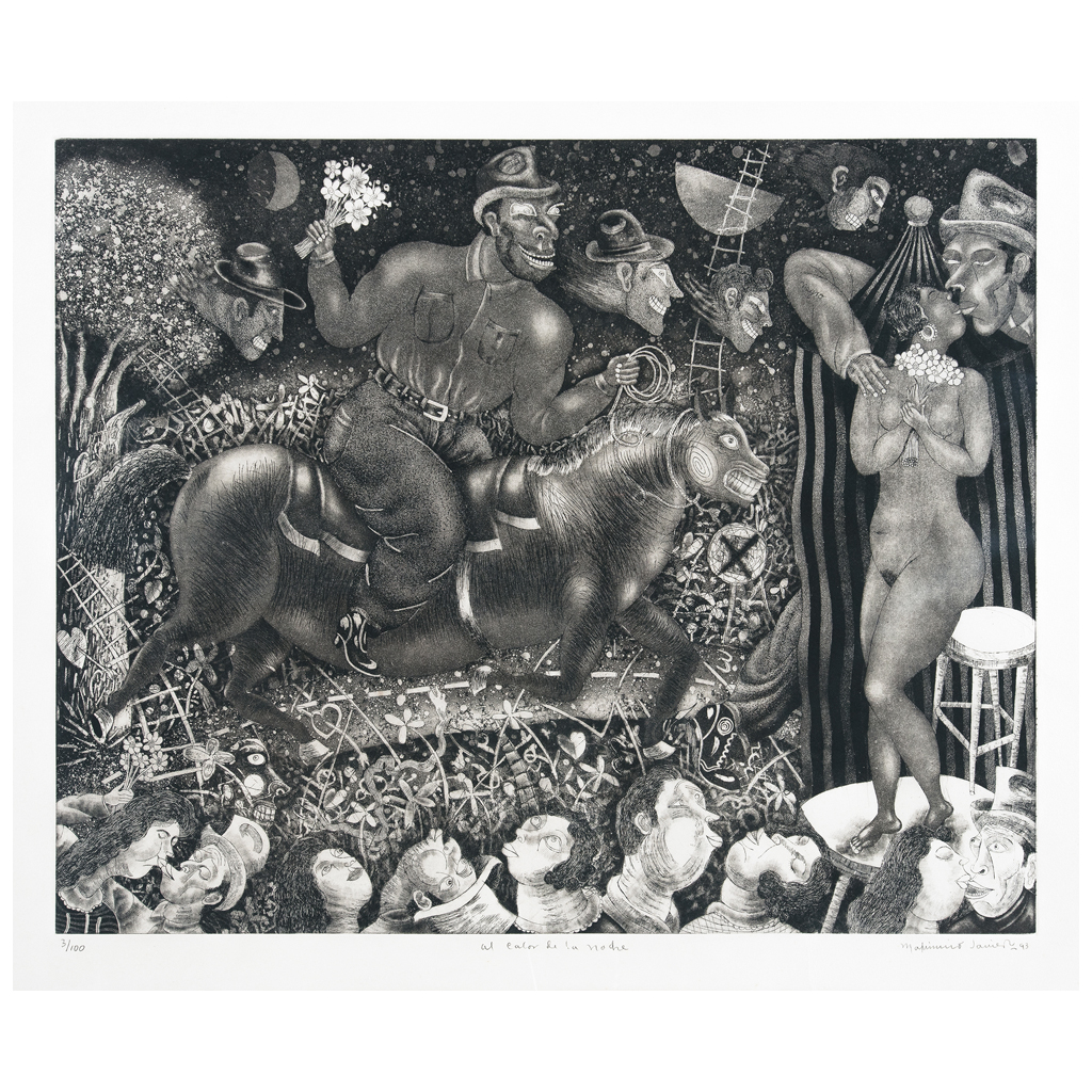 MAXIMINO JAVIER (Santa Fe y la Mar, Valle Nacional, Oaxaca, 1948 - ) Al calor de la noche Firmado y fechado 93 Grabado al aguafuerte 3 / 100 48.5 x 59.5 cm Estimado $ 10,000-15,000