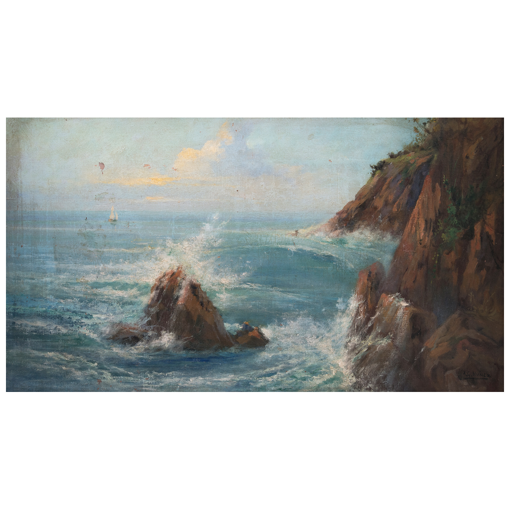 ARMANDO GARCÍA NÚÑEZ (Oaxaca, Oaxaca, 1883 - Ciudad de México, 1965) Sin título Firmado Óleo sobre tela Presenta detalles de conservación. Desde niño manifestó su interés por la pintura. En 1900 llegó a la ciudad de México, ingresó a la Academia de San Carlos donde estudió con los maestros Antonio Fabrés y Germán Gedovius. La obra de García Núñez abarca dos temas básicos: el paisaje, que domina en cantidad, y el desnudo, que contempla principalmente la figura femenina. Sus paisajes guardan un lirismo personal que refleja el amor que el artista profesó hacia la naturaleza. Fuente consultada: LARA ELIZONDO, Lupina. Resumen pintores y pintura mexicana. México. Promoción de Arte Mexicano, mayo-junio de 2001, año 6, No. 51, pp. 3-13. 30 x 54 cm Estimado $ 18,000-25,000