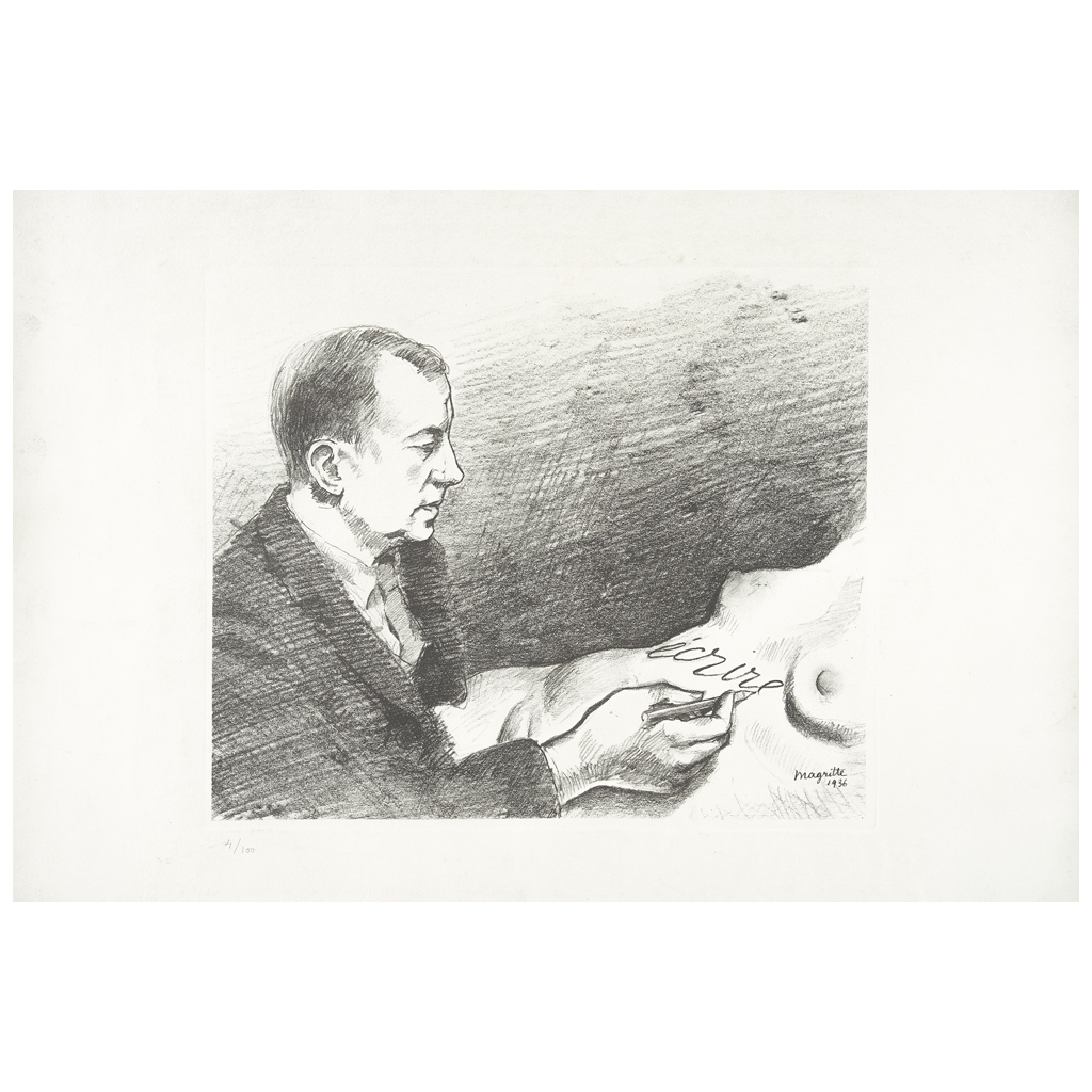 RENÉ MAGRITTE (Lessines, Bélgica, 1989 - Bruselas, Bélgica, 1967) Écrire, portrait de Paul Éluard Firmada y fechada 1936 en placa Litografía 4 / 100 Al reverso de la obra está impresa la leyenda: "Ce portrait de Paul Éluard a éte fixe avec mon accord: Georgette Magritte". Tanto para Magritte, como para Éluard, el cuerpo femenino era objeto de muchas metamorfosis ya fuera por medio del pincel del pintor, como por la pluma del escritor, instrumentos que consideraban con poderes casi mágicos. Esta obra refleja la imagen que Magritte tenía de su amigo. En este retrato, el poeta es representado escribiendo la palabra "Écrire" [escribir] en el cuerpo de su esposa Nusch, ilustrando perfectamente la misión de la poética de Éluard: la búsqueda de una intimidad imposible con el ser querido, el contacto directo del instrumento concreto de su arte con la carne de su poesía se lleva a cabo a través de otro sistema semiótico que complementa, alimenta y perpetúa el acto de creación. Fuente consultada: NIFOSI, Chiara. "Magritte: the mystery of the ordinary, 1926-1938". E.E. U.U. University of Chicago, junio de 2015, en www.nouvellefribourg.com 33 x 39 cm área impresa Estimado $ 15,000-25,000