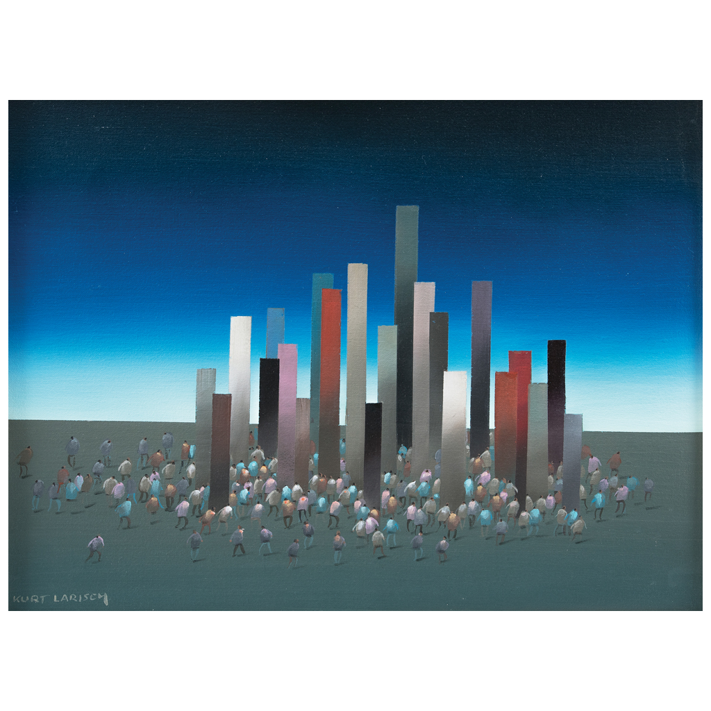 KURT LARISCH (Viena, Austria, 1913 - Sarasota, Florida, E.E. U.U., 2009) S - 66 Firmado al frente y al reverso Acrílico sobre tela Durante toda su carrera Kurt Larisch desarrolló un estilo propio, mismo que se convirtió en el tema central de una declaración única y personal en los tiempos modernos. Fue un pintor obsesionado con la situación del hombre en un mundo de constante autodestrucción. Su mensaje kafkiano era, como dijo un crítico, "una protesta civilizada contra la deshumanización". Es así, que mezclando su pensar con estilos abstractos y surrealistas, ejecutó pinturas con grandes elementos geométricos rodeados por masas de minúsculos personajes, aparentemente decididos a ir a un lugar, pero que en realidad no llegan a ninguna parte. Fuente consultada: sitio oficial del artista www.kurtlarisch.com 44.5 x 59 cm Estimado $ 30,000-50,000