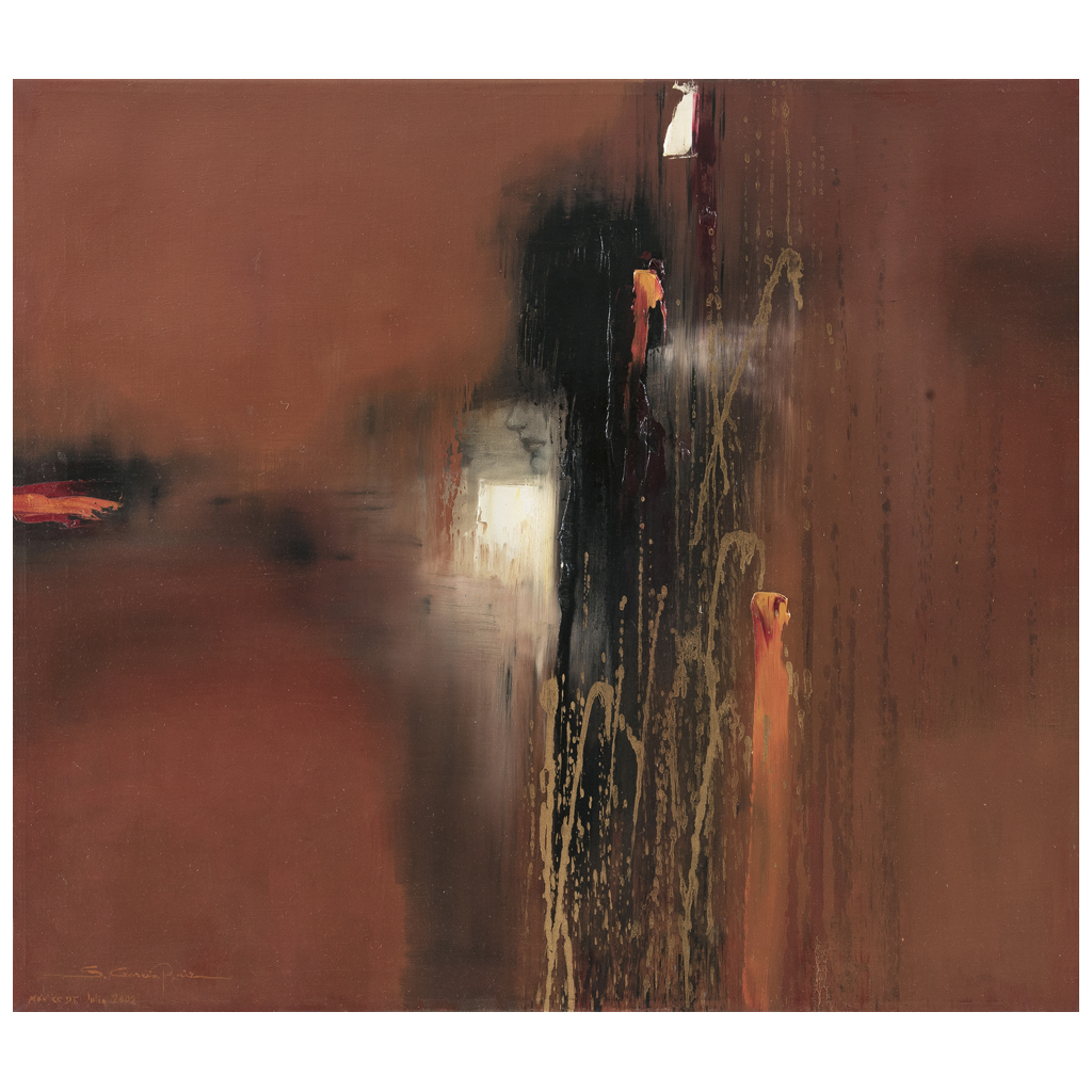 SUSANA GARCÍA RUIZ (Veracruz, Veracruz, 1945 - ) Intimidad Firmado y fechado Ciudad de México 2002 al frente. Firmado al reverso Óleo sobre tela Con certificado de autenticidad de la artista. Sus cuadros, ricos en elementos plásticos, han perfilado con vigor y determinación su personalidad artística. A través de fuertes contrastes logra plasmar lo espiritual en el hombre, como un ser humano sensible que ama y sufre. "Cuando reconoces tus sensaciones, tu ser y eres consciente del amor, la alegría de vivir y también del dolor, no puedes quedarte con todo eso dentro, necesitas expresarlo con arte". Susana García Ruiz. Fuente consultada: HERNÁNDEZ ESPÍNDOLA, Susana. "Con la pintura, salpico al mundo de mi espiritualidad". 70 x 80 cm Estimado $ 20,000-30,000