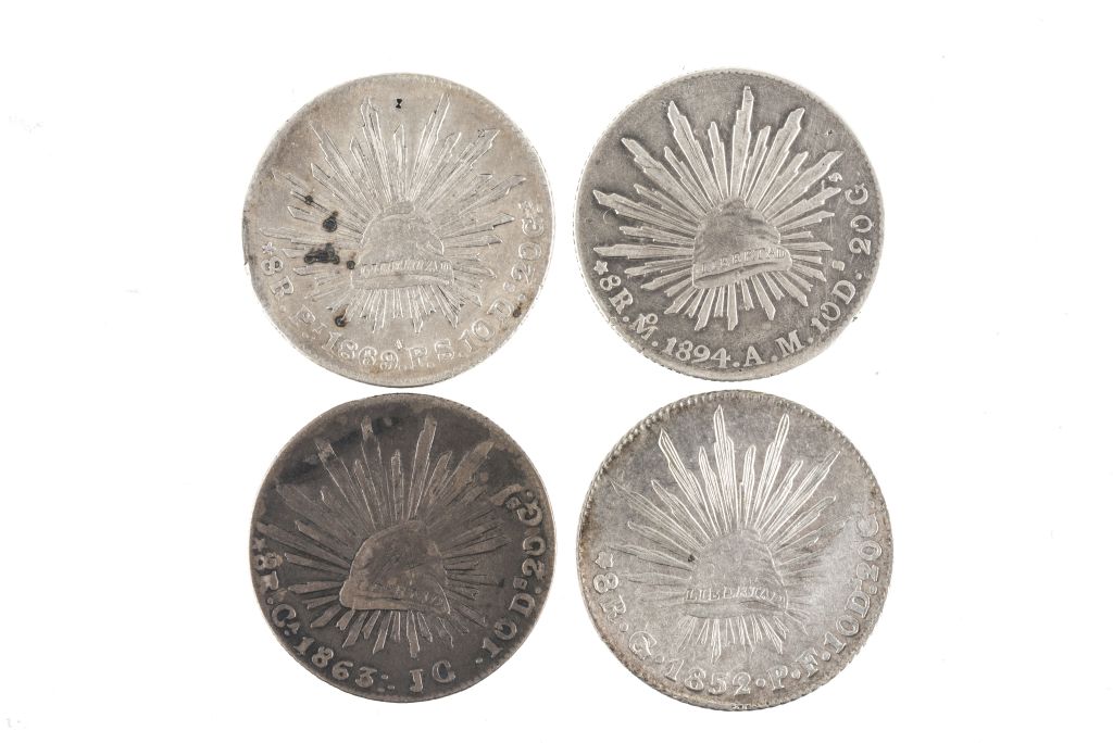 Plata, 39 mm. Anverso: Escudo Nacional con leyenda "República Mexicana". Reverso: Gorro frigio resplandeciente con la inscripción "Libertad", con leyenda: "8 R. -(Mo., Ca., G. y Pi.) - (1852, 1863, 1869 y 1894) - (A. M., J. C., P. F., y P.S. ) - 10 D. - 20 G.". Dos con pequeñas perforaciones. Piezas: 4.