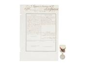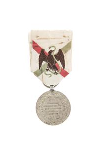 AJ - Expedición Francesa en México. Medalla y Hoja de Servicio. a) Barre, Albert Desiré. Medalla de la Expedición Francesa en México. Plata, 30 mm. Anverso: Efigie de Napoleón III, de perfil a la izquierda coronado con laurel, con leyenda "NAPOLEON III EMPEREUR". Rodeado por ramas de laurel. Exergo: "BARRE". Reverso: Muestra los nombres de las batallas libradas durante la Intervención Francesa "CUMBRES / CERRO-BORREGO / SAN - LORENZO / PUEBLA / MÉXICO, y la leyenda "EXPEDITION DU MEXIQUE, 1862 - 1863", y rodeado por ramas de laurel. Listón blanco con águila devorando una serpiente entre dos bandas diagonales de color verde y rojo. b) Hoja de Servicio Militar, Louis Kauffmann. Inicio en 1859 y el último registro fue en 1866. Destacan las expediciones a África y México; se le otorgó la medalla de la Expedición de México. Dos pequeños faltantes en margen izquierdo. Total de piezas: 2. Estimado $ 18,000-22,000