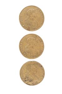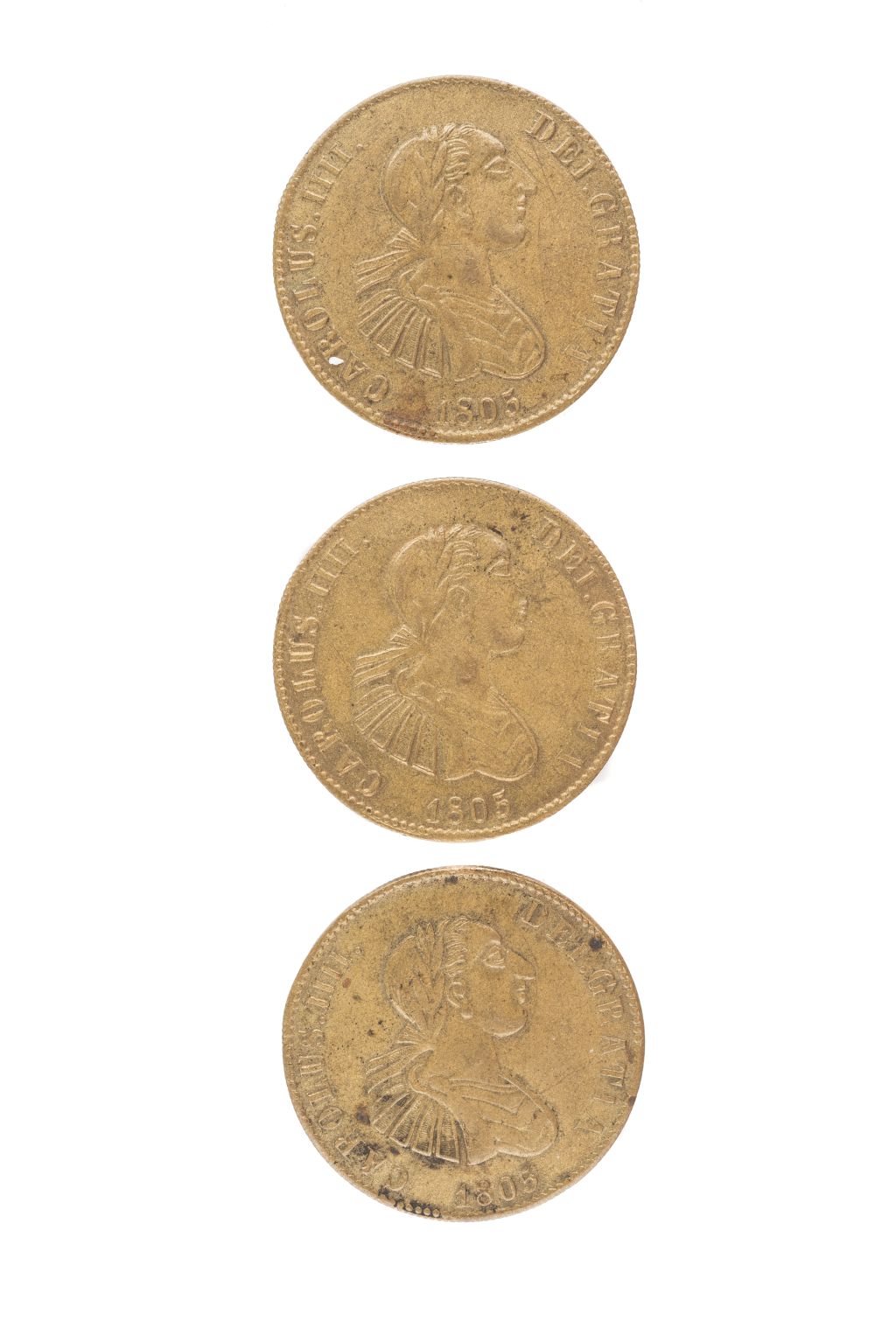AC - Boton Monetiforme, Carolus IIII. 1805. Bronce, 38 mm. Anverso: Efigie de Carlos IV mirando a la izquierda. Leyenda: "CAROLUS·IIII·DEI·GRATIA·1805". Reverso: Corona de laurel, estrella y doble lis, con asa. Piezas: 3. Los monetiformes, son piezas de diversos materiales ya sean de cobre, níquel, latón, aluminio, zinc, etc), baquelita o plástico, que, a diferencia de las monedas, no tienen valor de curso legal, porque han sido acuñadas por particulares, empresas, instituciones u organismos no oficiales. Véase en: http://enciclopedia_universal.esacademic.com/2324/Monetiformes Estimado $ 6,000-8,000