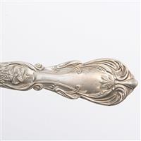 Consta de: 12 cuchillos, 12 tenedores para carne, 12 cucharas para sopa, 12 tenedores para postre, 12 cucharas para postre, 12 cucharas para té, 2 matequilleros, 12 tenedores para mariscos y 5 cubiertos de servicio.