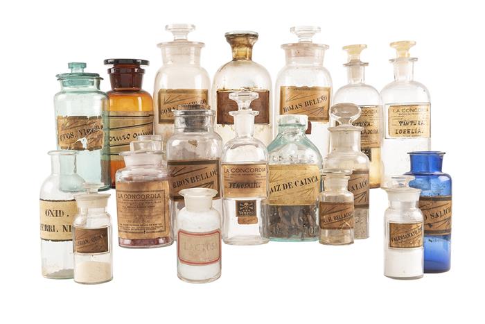 FRASCOS DE BOTICA FINALES DEL SIGLO XIX Elaborados en vidrio. Algunas leyendas: "RAÍZ DE CAÍNCA", "ÁCIDO GÁLICO", "VALERIANATO DE ZINC", "TINTURA DE BELLADONA", "HOJAS DE BELEÑO". Detalles de conservación. Total de piezas: 19. Estimado $3,000-5,000