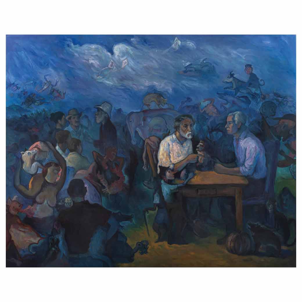 ALFREDO ALCALDE GARCÍA (Chimbote, Perú, 1961 - ) El universo del artista Francisco Toledo, de la serie Homenaje Artistas mexicanos Firmado Óleo sobre tela Con certificado de autenticidad del artista, julio de 2023. Agradecemos al Maestro Alfredo Alcalde por la verificación de autenticidad de esta obra, septiembre de 2023. "La presente obra 'El universo del artista Francisco Toledo', intenta hacer un homenaje, a quien es un gran referente como extraordinario creador, promotor cultural, filántropo, defensor de las lenguas indígenas e impulsor de proyectos preocupado por el respeto a la conservación de la naturaleza a través del Patronato Pro Defensa del Patrimonio Natural, Cultural y artístico de Oaxaca (ProOax). Su legado es enorme. Ser humano entrañable, de personalidad única, de quien tuve el honor de tener su amistad y en extensas charlas valorar y, entender más su pasión por la vida y el arte en sus múltiples manifestaciones. En su inmensa obra, metafórica y de frondosa fantasía, entrelazó colores, formas, texturas, volúmenes, invitándonos así a su sugestivo mundo de seres fantásticos. Fueron admirables sus acciones para fundar o apoyar la creación de editoriales, museos, fundaciones y otro tipo de instituciones; creando las condiciones para formar generaciones de perfil integral y libertad creativa. La dinámica creada es palpable, vasta visitar los espacios culturales que fundó para el disfrute y reflexión, como por ejemplo el IAGO, que alberga hermosas colecciones de libros, donde además se realizan constantes exposiciones y charlas. En esta hermosa biblioteca pude ver publicaciones de gráfica de grandes maestros y contemplar generaciones de niños y jóvenes leyendo y transcribiendo, con una alegría e interés incomparable. El hermoso pueblo de Oaxaca aprendió a valorar su patrimonio humano, cultural y natural a través de las incesantes batallas del pintor Francisco Toledo. ¡Gracias maestro!". Alfredo Alcalde García. 200 x 250 cm Estimado $1,900,000-2,500,000