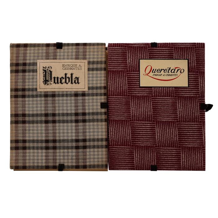 CERVANTES, ENRIQUE A. CIUDADES COLONIALES QUERÉTARO Y PUEBLA. a) Santiago de Querétaro en el Año de Mil Novecientos Treinta y Cuatro. México: Por el Autor, sin año. 4o. marquilla, 2 h. + 50 fotografías, montadas sobre cartulina. En carpeta forrada en tela. b) Puebla de los Ángeles en el Año de Mil Novecientos Treinta y Tres. México: Por el Autor, 1947. 4o. marquilla, X folios + 50 fotografías, montadas sobre cartulina. En carpeta forrada en tela. Total de piezas: 2. Estimado $2,500-6,000