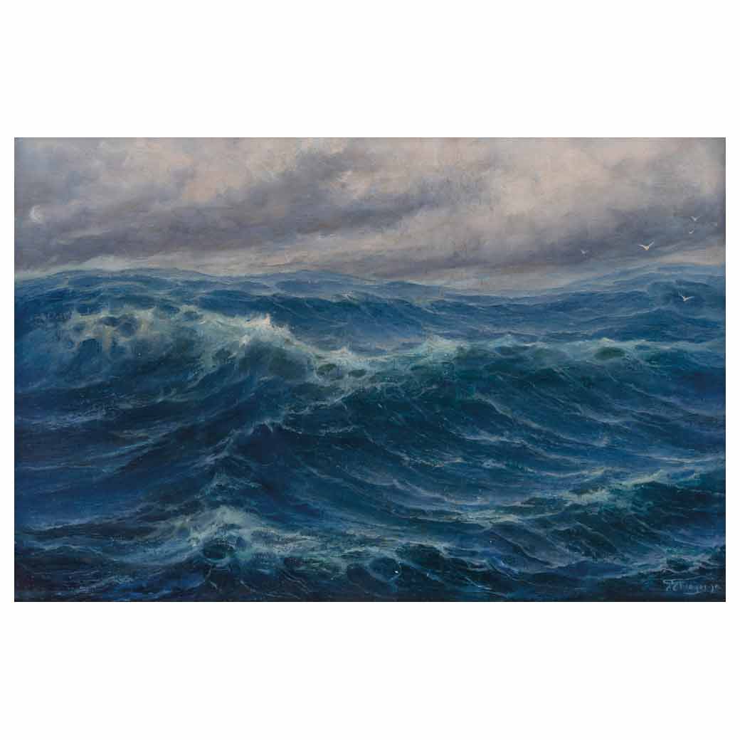 GUILLERMO GÓMEZ MAYORGA (Puebla, México, 1887 - 1962) Sin título Firmado Óleo sobre tela Presenta detalles de conservación y desprendimiento de capa pictórica. Guillermo Gómez Mayorga estudió en la Academia de San Carlos, donde fue un destacado alumno. Tuvo de maestro de perspectiva a Tomás Cordero, de dibujo a Leandro Izaguirre y de color a Germán Gedovius, de hecho, fue el propio director Alfredo Ramos Martínez, quien lo distinguió y recomendó en otros medios del arte en México. Durante sus estudios logró viajar a Francia e Italia, con el fin de pulir su técnica. Durante aquella época pinto varios cuadros con temáticas marinas y de costa, logrando exhibirlos en algunas galerías y muestras en Turín. Fue un destacado pintor del mar, género que ejecutó con gran majestuosidad, marcando la bravura del mar y las zonas de agua espumosa que provocan una sensación de belleza clásica, siendo estas las características que mas llamaron la atención de los críticos y coleccionistas. Inclusive el mismo Jorge González Camarena, comentó que: "Mayorga era un estupendo pintor de marinas". El autor del libro "José María Velasco y sus contemporáneos" Javier Pérez de Salazar y Solana, dijo que: "el pintor oriundo de puebla fue un extraordinario creador de célebres marinas que constituyen joyas de arte pictórico". Y Hugo Cervantes hizo referencia a la obra de artista como: "[…] Las sensaciones transmitidas por sus paisajes se deben a su conocimiento grafológico, su amor por la naturaleza y su aprendizaje en la cumbre de las vanguardias artísticas de la época". Fuente consultada: AMERLINCK, Rodrigo et al. Guillermo Gómez Mayorga. México. Fernández Cueto Editores, 1998, pp. 30-37 y 101-107. 60 x 90 cm Estimado $230,000-300,000