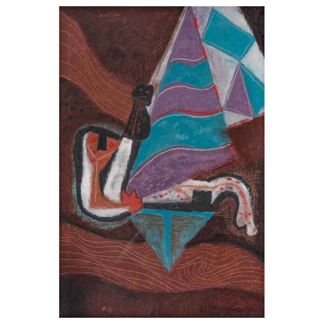 RODOLFO NIETO (Oaxaca, 1936 - Ciudad de México, 1985) Navegando en velero, ca. 1980 Firmado Óleo y esgrafiado sobre tela Con dedicatoria. Con constancia de opinión de Galería de Arte Mexicano, mayo de 2023. Presenta ligeras craqueladuras. Rodolfo Nieto siempre fue artista con alma rebelde, así que aunque no quiso realizar una formación academicista, siguió con gran fervor el trabajo de Carlos Orozco Romero y de Santos Balmori, así como de su mentor Juan Soriano. Su paso por Europa influyó fuertemente en su obra, en especial en su paleta de colores y formas abstractas. A su regreso a México, amplió la experimentación con técnicas, las cuales enriquecieron su quehacer artístico, además empezó a estudiar el arte prehispánico y la cultura popular, incorporando en su obra nuevas estructuras. "Nieto tendió a saturar sus composiciones, adhiriendo o rodeando la imagen principal de un sinnúmero de elementos que pueden encontrarse irregularmente geometrizados, como grecas o tableros, igualmente suele acudir a finísimos chorreados, que se antojan siempre controlados, tal que si huyera del vacío". Teresa del Conde. Fuentes consultadas: MORENO VILLARREAL, Jaime. Lo que era todo tiene que ser nada. Homenaje a Rodolfo Nieto. México. Museo de Arte Contemporáneo de Monterrey, 1995 y DEL CONDE, Teresa. "Rodolfo Nieto: retrospectiva." México. Diario La Jornada, 20 de abril de 2010. 90 x 60 cm Estimado $780,000-1,000,000