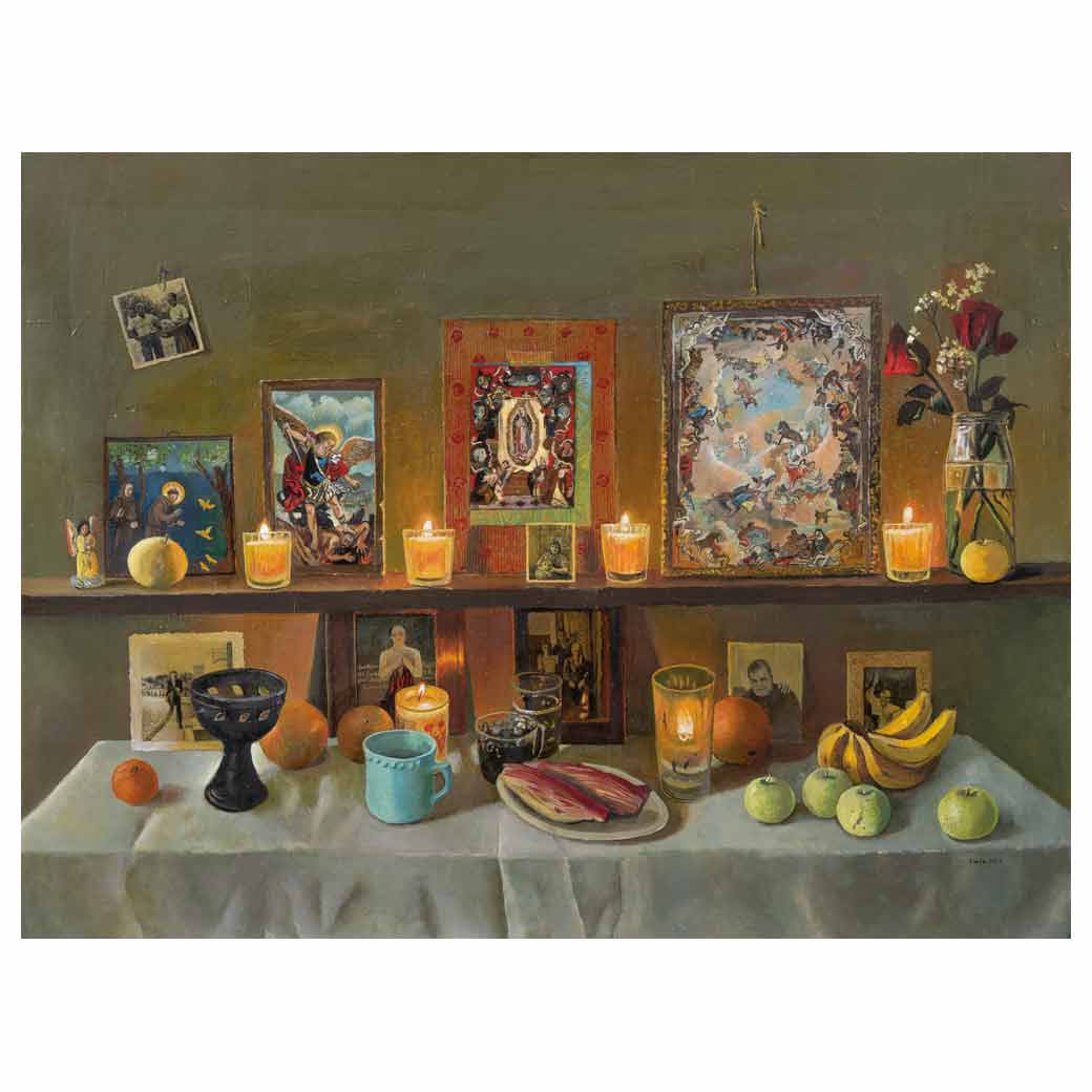 ELENA CLIMENT (Ciudad de México, 1955 - ) Altar con fotos y veladoras Firmado y fechado 2023 al frente. Firmado en bastidor Óleo sobre tela Con certificado de autenticidad de la artista. Publicada en: Instagram oficial de la artista instagram.com/elena_climent Presenta detalles de conservación. A los 16 años decidió convertirse en artista, sin embargo, no recibió una educación formal, en parte porque su padre, el artista español Enrique Climent no aprobaba la línea académica. Tuvo su primera exhibición en 1972 en la Ciudad de México. En los años ochenta comenzó a pintar escenas basadas en fotografías de ventanas, puertas y balcones que encontraba caminando por la ciudad. Poco después se mudó a Nueva York, donde continuó usando sus viejas fotografías para realizar obras en las que exploraba los paisajes urbanos de México, así como distinciones entre espacios interiores y exteriores. A través de la representación de objetos y escenas cotidianas, logra dar al espectador un vistazo hacia la vida de los mexicanos. Fuente consultada: sitio oficial de Galería Mary-Anne Martin www.mamfa.com 61 x 81 cm Estimado $200,000-280,000