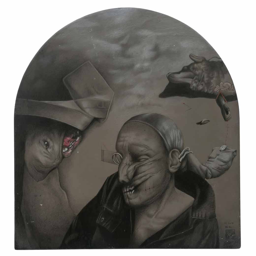 ARTURO RIVERA (Ciudad de México, 1945 - Ciudad de México, 2020) Daniel en la cueva de los leones, de la serie El Rastro del dolor Firmado al frente. Firmado y fechado 1985 al reverso Lápiz graso y óleo sobre tela sobre madera Exhibido en: "Arturo Rivera: Bodas del Cielo y del Infierno", muestra itinerante presentada en el Museo de Arte Moderno de la Ciudad de México en 1995 y en el Museo de Arte Contemporáneo de Monterrey, del 13 de junio al 23 de noviembre de 1997. Con etiquetas de Instituto Nacional de Bellas Artes, del Museo de Arte Moderno de la Ciudad de México y Museo de Arte Contemporáneo de Monterrey. Presenta detalles de conservación. Arturo Rivera se formó en la Academia de San Carlos, más tarde tomó lecciones de serigrafía en The City Lil Art School en Londres. Vivió en Nueva York durante ocho años, donde realizó por un periodo labores que no estaban ligadas al quehacer artístico, sin embargo regresó a México, atendiendo la invitación del Museo de Arte Moderno donde expuso por primera ocasión. Su obra se define por confrontar al espectador con su condición humana, de esta manera, los personajes que protagonizan sus composiciones sirven de reflejo de la vulnerabilidad del ser. Actualmente sus piezas forman parte de colecciones importantes como la del Museo de Arte Moderno de la Ciudad de México y el Museo de Arte Contemporáneo de Monterrey. Por su parte, de manera internacional podemos encontrar su obra en el Instituto Cultural Mexicano en Washington y colecciones privadas de Houston y Nueva York, además del Museo de la Tertulia de Cali en Colombia, el Banco Central de Quito en Ecuador y el Haus der Kunst de Munich en Alemania, entre otros mundialmente reconocidos .Fuente consultada: sitio oficial del Museo de Arte Contemporáneo de Monterrey www.marco.org.mx 63 x 60 cm Estimado $90,000-150,000
