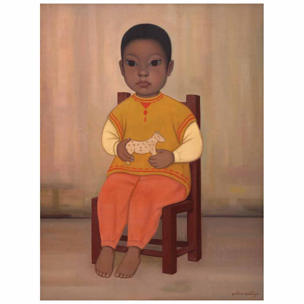 GUSTAVO MONTOYA (Ciudad de México, 1905 - Ciudad de México, 2003) Niño con juguete, de la serie Niños Mexicanos Firmado Óleo sobre tela Con certificado de autenticidad de Galería Inverarte. Gustavo Montoya es considerado un poeta de la pintura, moderno, perfeccionista y emocional. Si bien comenzó su formación de manera académica, optó por tomar su propio camino, viajando a Estados Unidos y algunos países de Europa, donde trabajó y dio a conocer su obra con gran éxito. En dichas experiencias enriqueció su bagaje artístico y lo unió a su herencia mexicana, creando así un estilo pictórico personal e interesante. En su obra podemos apreciar una decantación por el lenguaje de la modernidad, logrando ejecutar piezas de composiciones limpias, paleta de color delicadamente seleccionada y falsas perspectivas con el fin de apreciar la totalidad de los elementos expuestos. Fuentes consultadas: RULFO, Juan et al. Gustavo Montoya. México. Litógrafos Unidos S. A., 1981, pp. 45-62 y LARA ELIZONDO, Lupina. Resumen. Pintores y pintura mexicana. México. Promoción de Arte Mexicano, año 4, no. 40, julio-agosto 1999, pp. 10-12. 61 x 46 cm Estimado $300,000-500,000