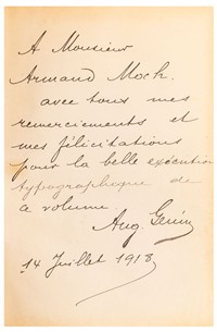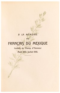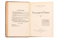 GENIN, AUGUSTE. VERS POUR LA FRANCE. MÉXICO: IMPRENTA FRANCO-MEXICANA, 1918. 8o. marquilla, XVI + 200 p. Firmado y dedicado por Auguste Genin para Marianne Moch. Cajos quebrados, sin lomo. Encuadernados en pasta dura, en piel. Estimado $1,000-2,000