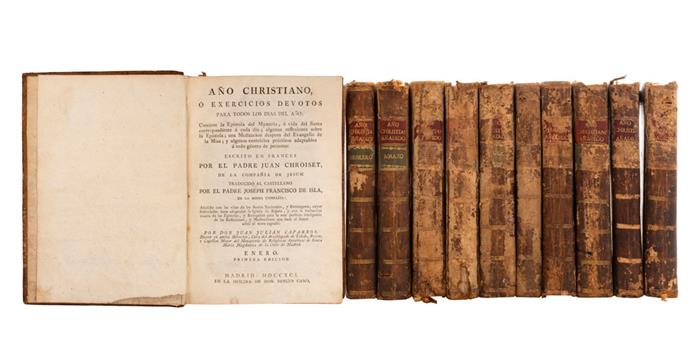CROISET, JUAN. AÑO CHRISTIANO O EXERCICIOS DEVOTOS PARA TODOS LOS DÍAS DEL AÑO. MADRID: EN LA OFICINA DE DON BENITO CANO, 1791. 8o. marquilla, 3 h. + 519 p.; 3 h. + 446 p.; 3 h. + 550 p.; 3 h. + 531 p.; 3 h. + 512 p.; 3 h. + 572 p.; 3 h. + 536 p.; 3 h. + 562 p.; 3 h. + 460 p.; 3 h. + 534 p.; 2 h. + 396 p. Enero - Abril, Junio, Julio y Septiembre - Diciembre y Suplemento (Tomo II). Contiene la explicación del Mysterio, o la Vida del Santo correspondiente a cada día; algunas reflexiones sobre la Epístola, una Meditación después del Evangelio de Misa, y algunos exercicios prácticos de devoción, o propósitos adaptables a todo género de personas. Algunos ejemplares con puntos y surcos de polilla y manchas de humedad. Pastas y lomos deteriorados, algunos con faltantes. Encuadernados en pasta dura, en piel. Piezas: 11. Estimado $1,300-8,000
