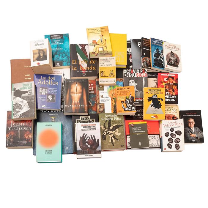 LITERATURA, HISTORIA ANTIGUA, HISTORIA NOVELADA Y POLÍTICA DE MÉXICO. Algunos autores y títulos: Octavio Paz "Los Signos en Rotación"; Ramón Córdoba "el Libro de los Guardianes", Carlos Montes "Horóscopos Aztecas"; Eugenio Aguirre "Isabel Moctezuma"; Fabrizio Mejía Madrid "Salida de Emergencia"; José Fernández Santillán "Política, Gobierno y Sociedad Civil"; Antonio Velasco Piña "Cartas a Elisabeth"; Alonso de Zorita "Los Señores de la Nueva España"; Christopher Domínguez Michael "Octavio Paz En Su Siglo"; José Elías Romero Apis "El Jefe de la Banda"; Geofrey Pleyers "México en Movimientos"; José Barragán B. "Teoría de la Constitución"; Jorge Volpi "La Imaginación y el Poder: Una historia intelectual de 1968; Octavio Paz "Arenas Movedizas". Varios formatos. Encuadernados en rústica y en pasta dura. Piezas: 36. Estimado $1,000-3,000
