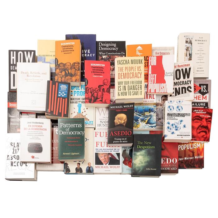 DEMOCRACIA, POLÍTICA, ECONOMÍA Y OTROS TEMAS. Algunos títulos: The People vs. Democracy; Capitalismo. Socialismo y Democracia; Deliberation Day; Fuego y Furia en las Entrañas de la Casa Blanca de Trump; Upheaval: Turning Points for Nations in Crisis; Capitalism, Socialism and Democracy; Hyper Worlds, Underworlds; People, Power, and Profits; Mega Capitalistas la Élite que Domina el Dinero y el Mundo; Who Are We? The Challenges to America 's National Identity; Death, Rebirth, and Revolution: Archetypal Dynamics and Personal Experience; Miedo: Trump en la Casa Blanca; The New Despotism; US vs. Them the Failure of Globalism. Varios formatos. Encuadernados en rústica y en pasta dura. Piezas: 33. Estimado $800-3,000