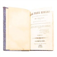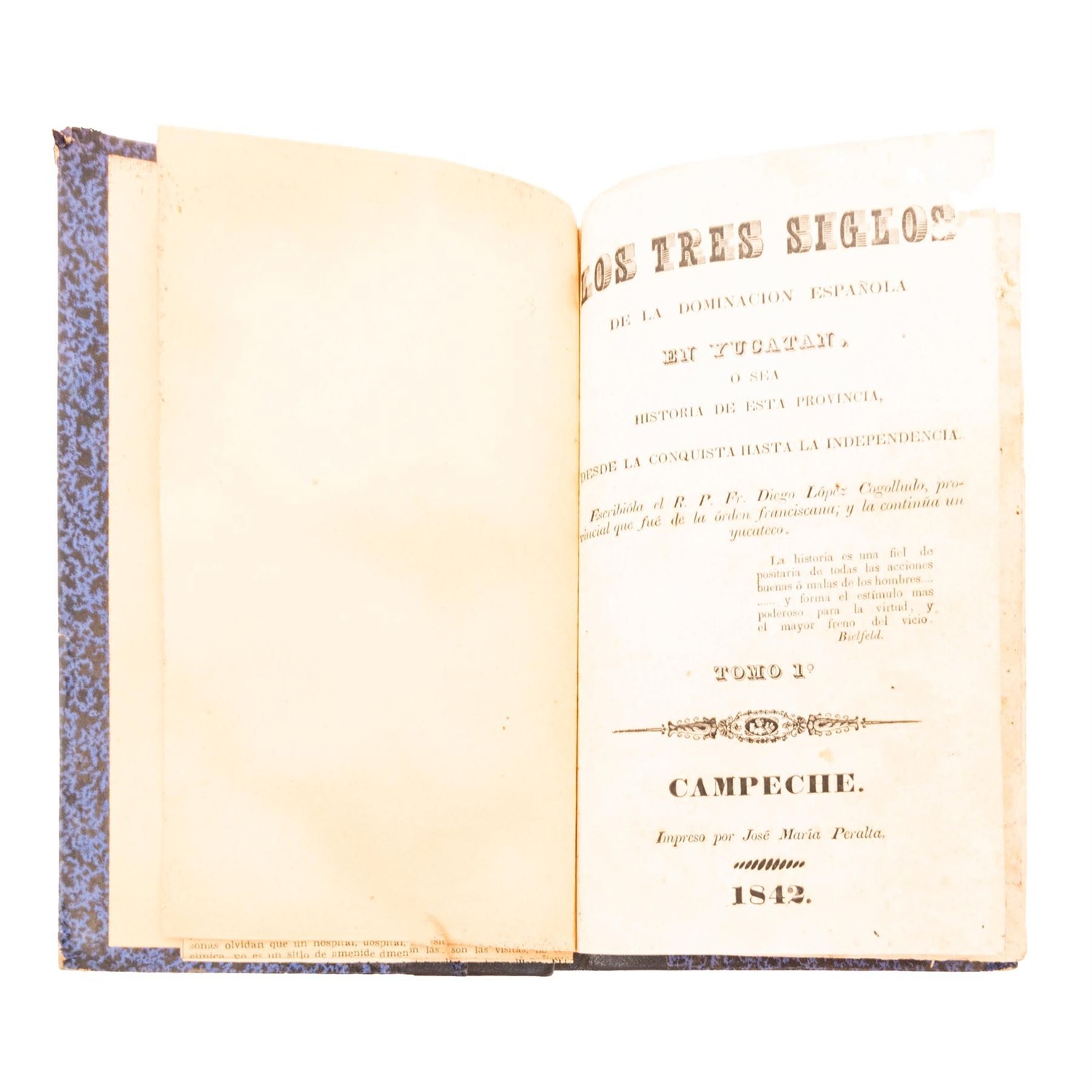 LOS TRES SIGLOS DE LA DOMINACIÓN ESPAÑOLA EN YUCATÁN O SEA HISTORIA DE ESTA PROVINCIA DESDE LA CONQUISTA HASTA LA INDEPENDENCIA. CAMPECHE: JOSÉ MARÍA PERALTA, 1842. 8o. marquilla. 481 p. + 3 h. Tomo I. Escribíola el R.P.Fr. Diego López Cogolludo, provincial que fue de la orden franciscana; y la continua un yucateco. Ejemplar con surcos y puntos de polilla, afecta poco texto. Encuadernado en pasta dura, lomo en piel. Considerada la segunda edición de la obra de Diego López Cogolludo; editada por Justo Sierra O'Reilly. Estimado $3,500-5,000