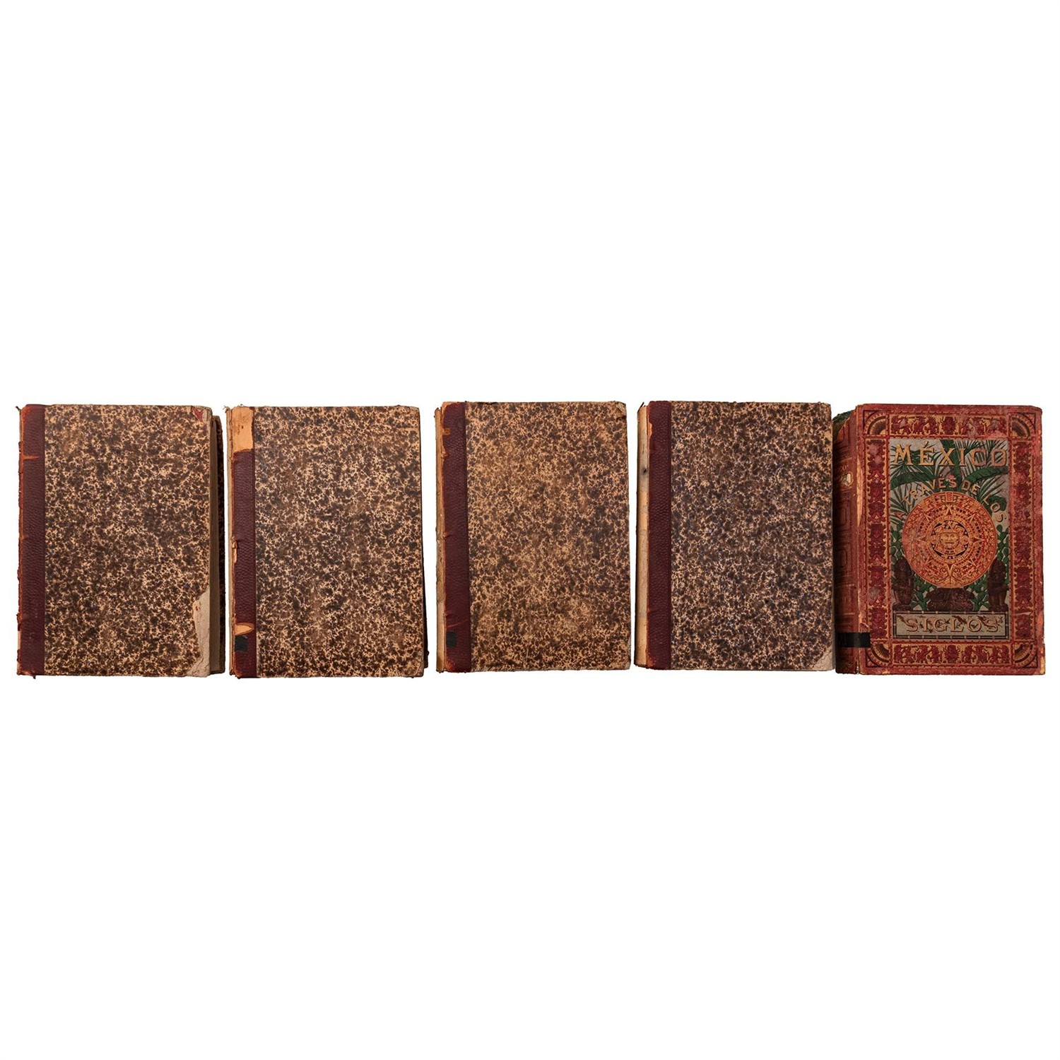 RIVA PALACIO, VICENTE. MÉXICO A TRAVÉS DE LOS SIGLOS. MÉXICO - BARCELONA: BALLESCÁ Y COMP., EDITORES - ESPASA Y COMP., EDITORES, CA. 1884 - 1889. fo. marquilla. Primera edición. Tomos I - V. Ilustrados con cromolitografías y grabados intercalados en el texto. Obra única en su género e imparcial y concienzudamente escrita en vista de cuanto existe de notable y en presencia de preciosos datos y documentos hasta hace poco desconocidos. Tomo I: Historia Antigua y de la Conquista por D. Alfredo Chavero. Tomo II: El Virreinato. Historia de la Dominación Española en México desde 1521 a 1808 por D. Vicente Riva Palacio. Tomo III: La Guerra de Independencia por D. Julio Zárate. Tomo IV: México Independiente 1821 - 1855 por D. Enrique Olavarría y Ferrari. Tomo V: La Reforma por José M. Vigil. Sin lomos. Algunas páginas desprendidas. Encuadernados en pasta dura, lomo en piel. Piezas: 5. Palau: 167520. Porrúa 1949: 7509. Considerada como la primera obra monumental que unió de manera cronológica la historia de México, es decir, es la primera historia general de México. Busca reivindicar el pasado prehispánico y virreinal como parte de la historia nacional; los grandes literatos del siglo XIX tratan de explicar "el ser mexicano" de entre un gran número de corrientes políticas, ideológicas y sociales. La idea principal de Riva Palacio fue generar una coalición entre estas posturas. Editada originalmente por entregas a cargo de Casa Ballescá entre 1884 - 1889. El proyecto de crear una obra monumental, reside en la apertura de México a la corriente positivista erudita del Siglo XIX. Véase en: Saldívar, Luz del Carmen. La Escritura de la Historia Mexicana: "México a Través de los Siglos". Estimado $3,500-5,000