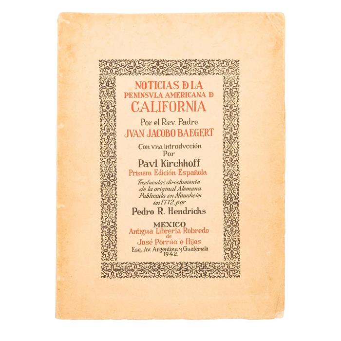 BAEGERT, JVAN JACOBO. NOTICIAS DE LA PENINSVLA AMERICANA DE CALIFORNIA. MÉXICO: ANTIGUA LIBRERÍA ROBREDO DE JOSÉ PORRÚA E HIJOS, 1942.